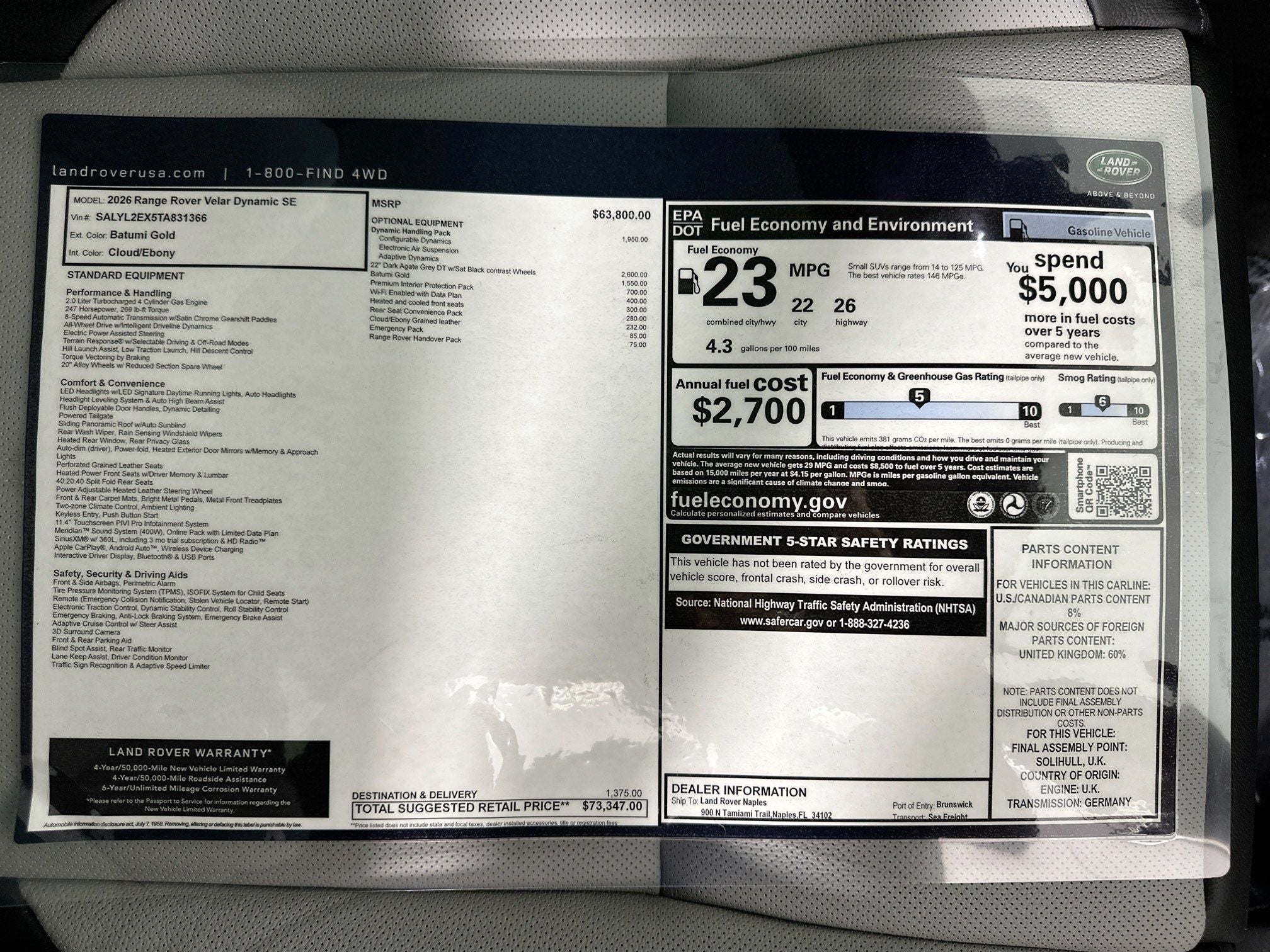 2026 Land Rover Range Rover Velar Dynamic SE Dynamic SE Gold 4D Sport Utility 2.0L I4 Turbocharged AWD 8-Speed Automatic